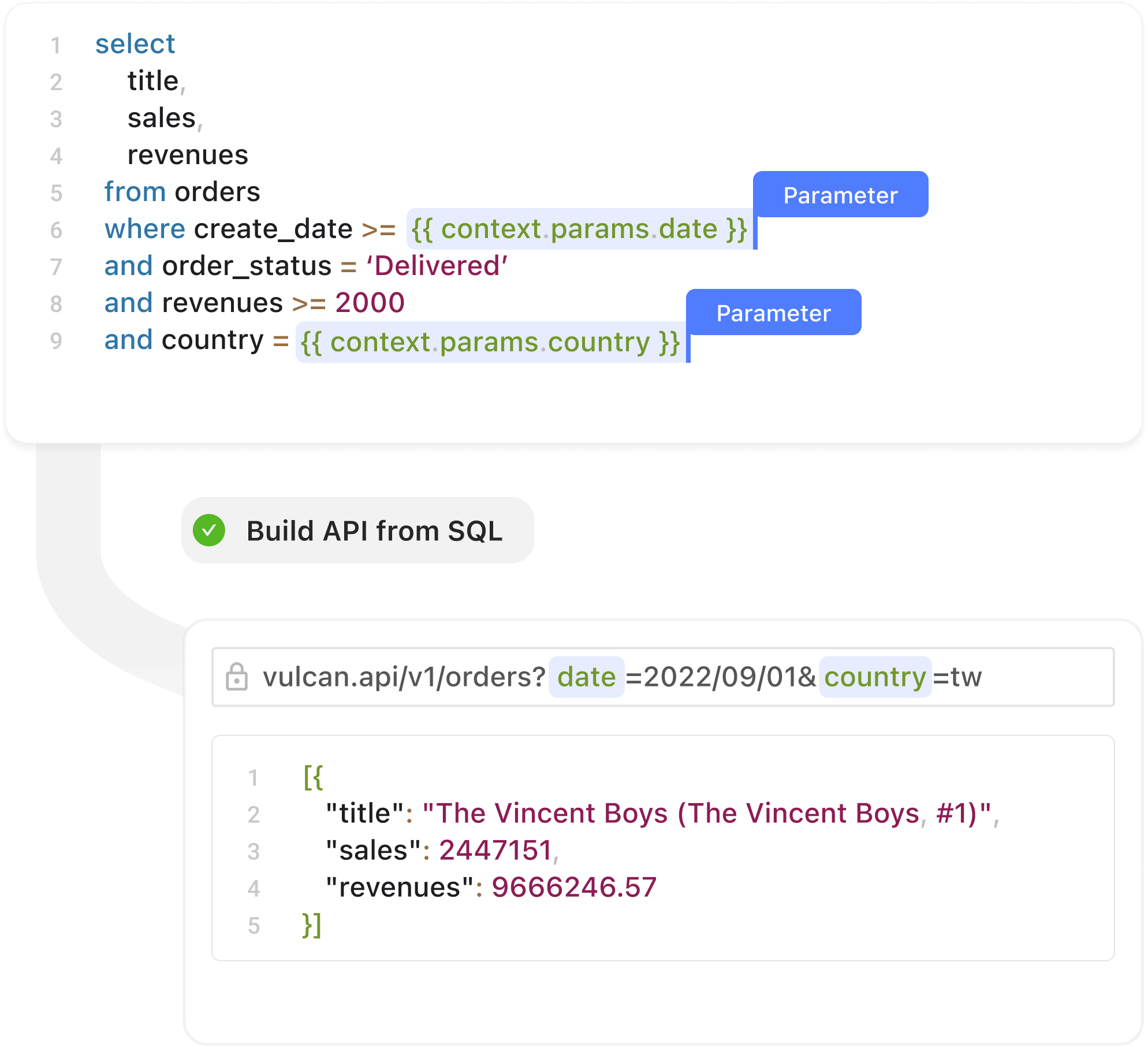 VulcanSQL is an Analytics API generator that helps data engineers to build scalable analytics APIs using only SQL without writing any backend code.